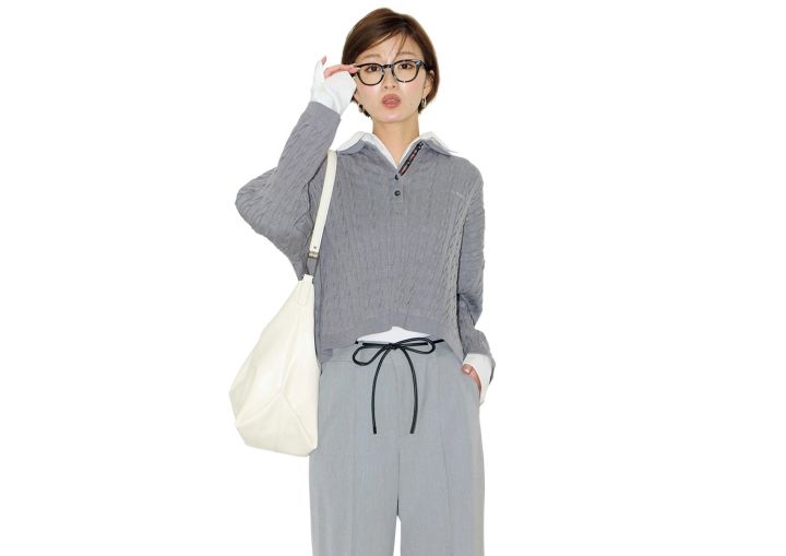 シャツとポロニットをレイヤードしたようなデザイントップス。シックなオールグレーのワンツー合わせなら、カジュアル度を増したアイテムを選んでもきちんと見えが叶う。