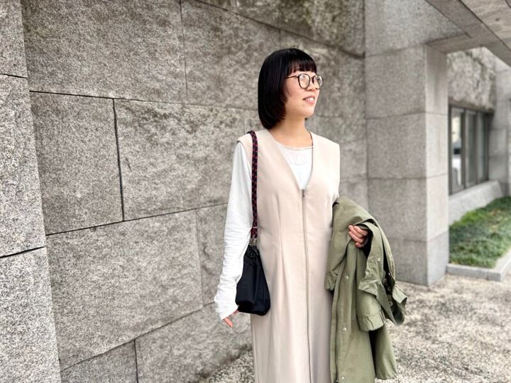 言葉通りの三寒四温。寒さがぶり返した京都の街で、ペールトーンのやさしい着こなしが印象的だった大木さん。「まだまだ寒さが残りますが、服装だけでも春の気分で。今からお茶にでも出かけようかなと思っていたところです」。大人世代になり、服装や髪型を模索する中、「明るめの色をどこかに取り入れることと、子供っぽくなりすぎないように気をつけています」。
