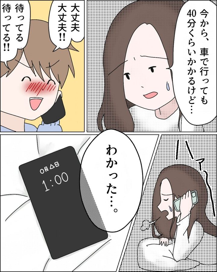 「今から車で行っても40分くらいかかるけど・・」エミさんがそう言うと「大丈夫、大丈夫!!待ってる待ってる!!」とエミさんの負担は全く考えていない様子のレイさん。迎えに行くしかないと諦めたエミさんはハァ~と大きな溜息をつき「わかった・・」と答えました。この時点でもう深夜1時です。