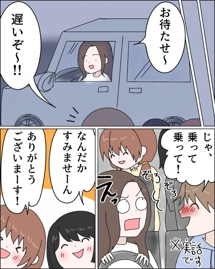 「いいよいいよ、みんな送る~!なっ!エミ!」と調子の良いことを言うレイさん。この状況で拒否などできるはずもなく・・エミさんは「もうみんな乗ってるじゃん」とボソッと呟くのが精一杯。彼氏を迎えに来たはずが、なぜか彼氏の女友達まで自宅へ送り届けることになってしまったのでした。