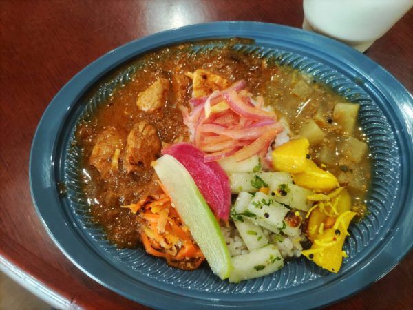こちらは看板メニューのスパイスカレー。野菜とカレーを一緒に食べるのがオススメだそうです。色々食べたい人向けの少なめメニューもありましたよ。