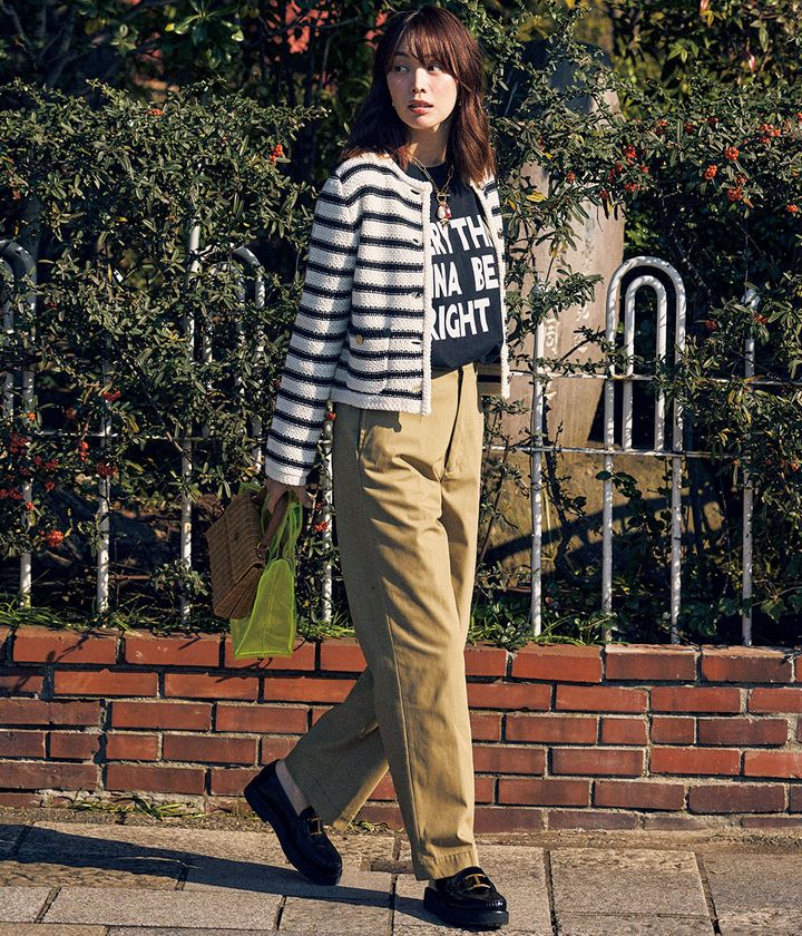 チノパンツ¥23,100(ザ シンゾーン/シンゾーン 表参道本店)カーディガン¥22,000(ジャスグリッティー)Tシャツ¥13,200(エムズブラック/ユナイテッドアローズ 六本木ヒルズ店)バッグ¥37,400〈ソレイアード〉ネックレス¥59,400〈リジーフォーチュネート〉(ともにトゥモローランド)イエローバッグ¥22,000(テンベア/テンベア トウキョウ)ローファー¥116,600(トッズ/トッズ・ジャパン)ピアス¥38,500(リューク)