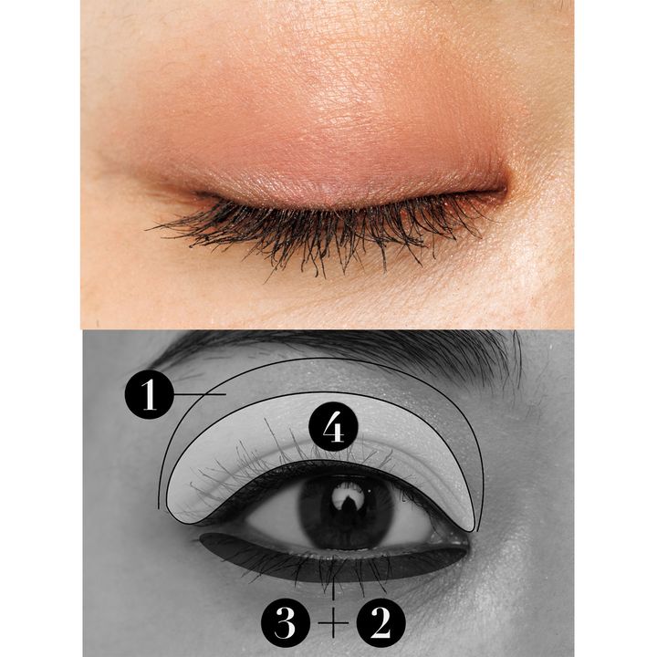 ①のラメピンクをアイホールに、④のマットピンクをそれより2ミリほど狭い範囲に。②と③を混ぜて下まぶたキワに細く入れて。