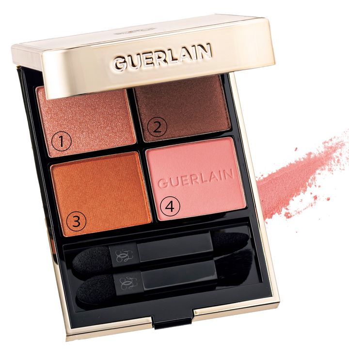 2つの質感の柔らかなピンクと温かみのあるオレンジブラウンが大人の目元に優しげな目力を。オンブル ジェ129 ハニーアンバー ¥10,780(ゲラン)