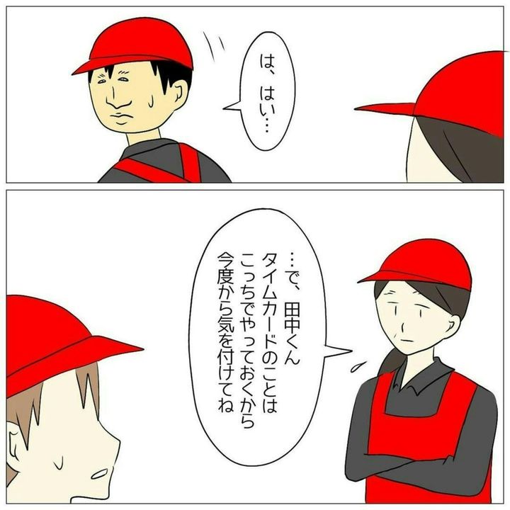 田中くんは、ハンバーガーショップでのアルバイトを始めたものの、いつもシフトがかぶる先輩「小林」からきちんと指導を受けることができず、困り果てていました。さらに、ある日出勤したところ、自分のタイムカードが見当たりません。外に持ち出すことはないため、疑問だけが残ります…。