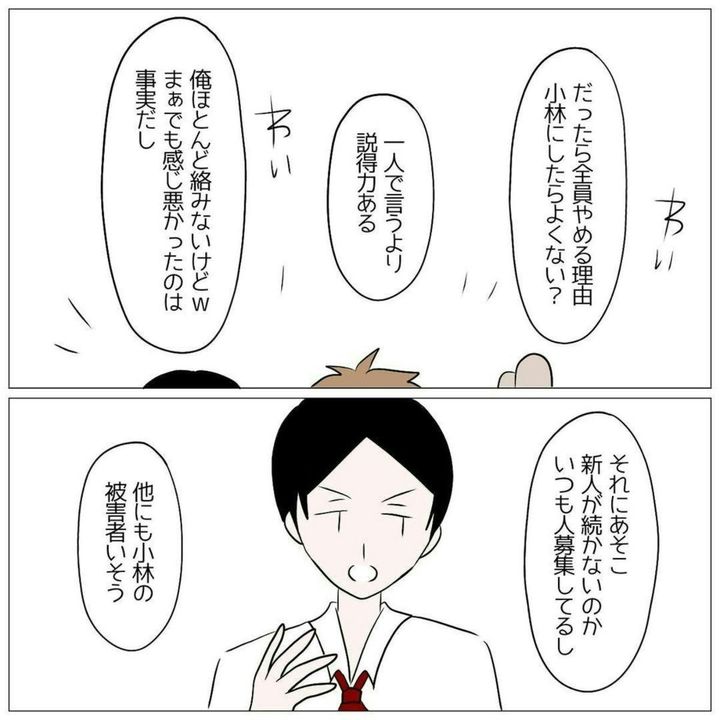 このあと、田中くんが「辞める」と告げたのを皮切りに、きゅきゅさんが続きます。しかも、辞める宣言をしたのは、店長と小林など、他のメンバーもいる前で「いじめられたから」と主張しました。すると、小林は明らかに動揺し、個別で店長から追及されます。また、野辺くんの予想した通り、他にも被害者がいたため、小林がいじめ常習犯であることが発覚。