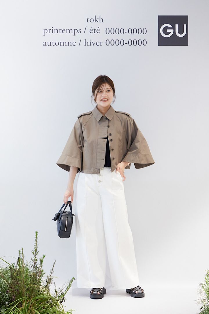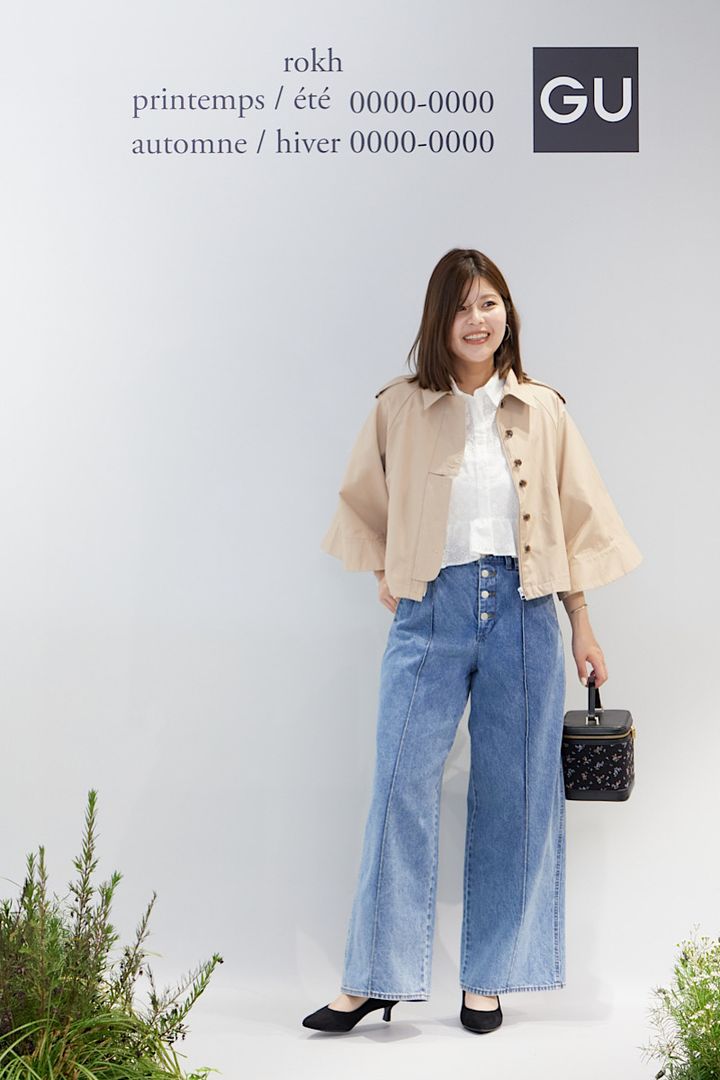 ショートケープコート[32 BEIGE]¥4,990 ペプラムシャツ¥2,990ワイドジーンズ ¥3,990 バニティバッグ¥2,990(すべてGU×rokh/ジーユー)マシュマロパンプス¥2,990(ジーユー)