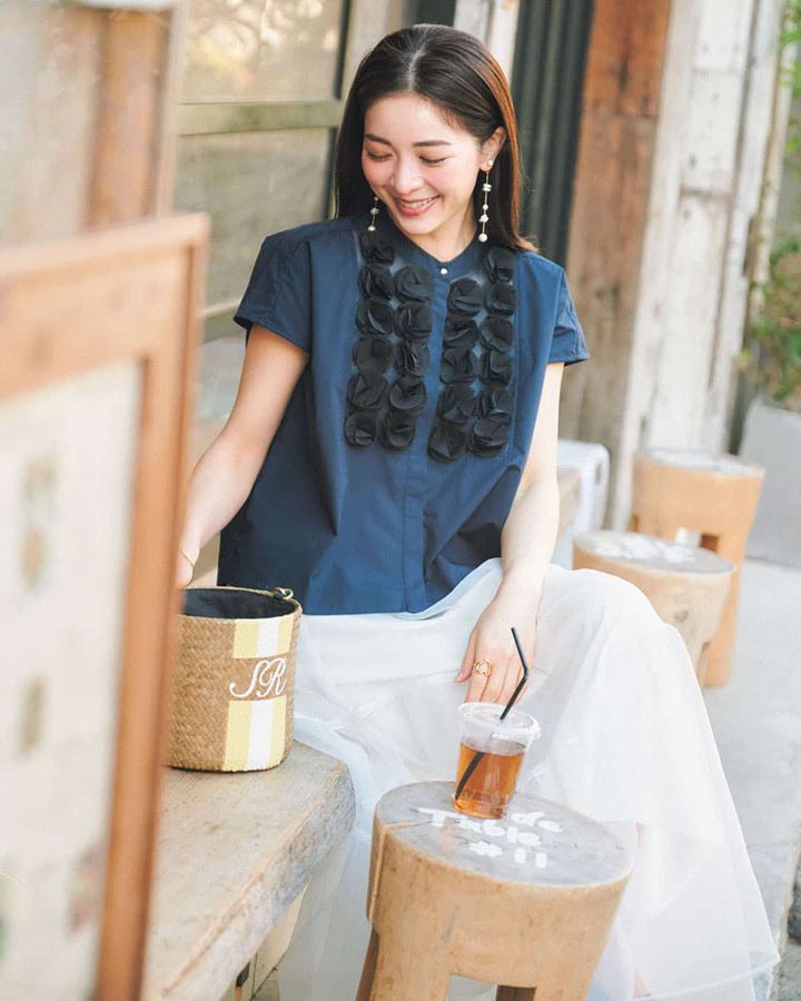 ブラウス¥14,500(トラッツォドンナ)バッグ¥35,750(seedpod)スカート¥16,500(アルページュストーリー)イヤリング¥5,720〈アプロ〉リング¥19,800〈tsugumi iwamoto〉(ともにロードス)バングル¥96,800(ウノアエレ/ウノアエレ ジャパン)