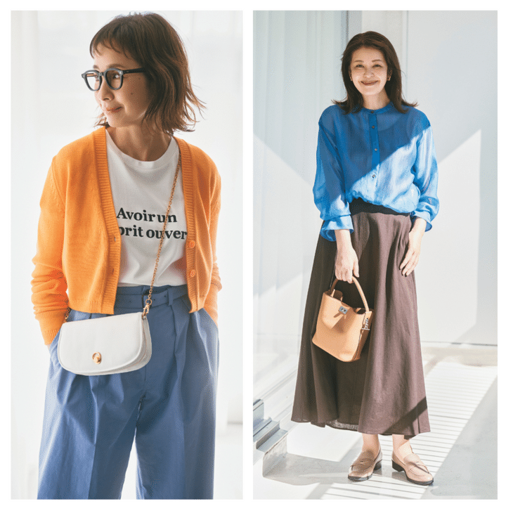 撮影/人物 _ 西﨑博哉〔MOUSTACHE〕、物 _ 山下忠之 スタイリスト/飯田聡子 ヘア &メイク/森 ユキオ〔ROI〕 モデル/岩井ヨシエ、菜木のり子 文/三宅桃子 ※素敵なあの人2025年5月号「春のカラーアイテムの取り入れ方教えます」より