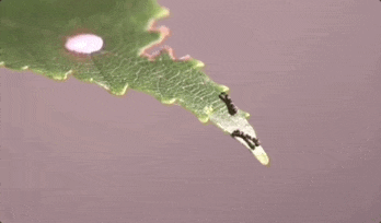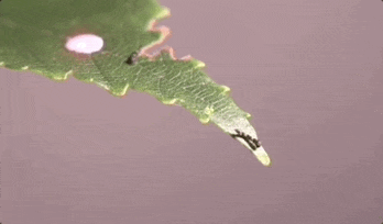 チームは、葉っぱの先端に陣取った幼虫に、もう1匹の幼虫を侵入させる実験を実施。