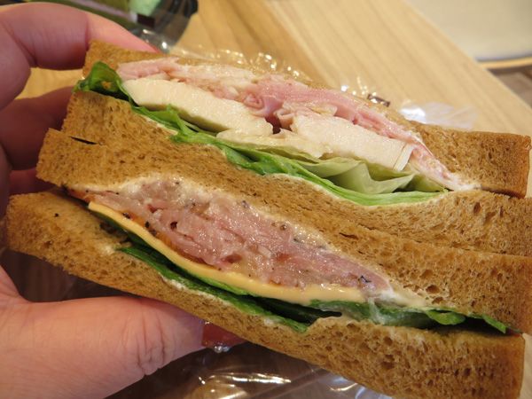 お次はサンドイッチ。 パストラミ―ポーク、ポークシュゼットハム、低音調理チキンの3種類が入っていて、片手にずっしりくるボリューム。 食欲をそそる断面がたまりません。