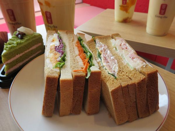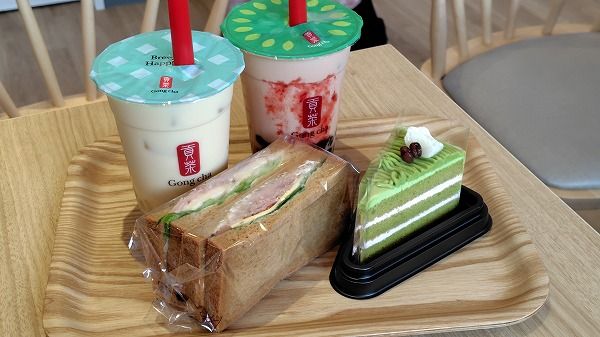 私が選んだのは、写真左のピーチジャスミングリーンミルクティーにおすすめトッピングのアロエをカスタムしたもの。 さらにフードは、「カフェサンドこだわりの3種ミート」をチョイス。 まずはドリンクから。