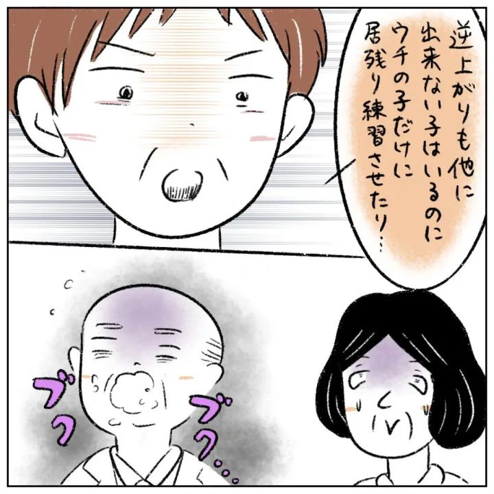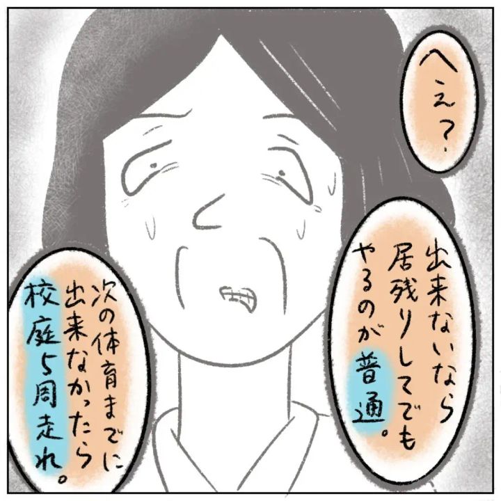 お母さんは、まるさんから聞いていた内容を話し始めました。「へぇ?『出来ないなら居残りしてでもやるのが普通』。『次の体育までに出来なかったら校庭5周走れ』」