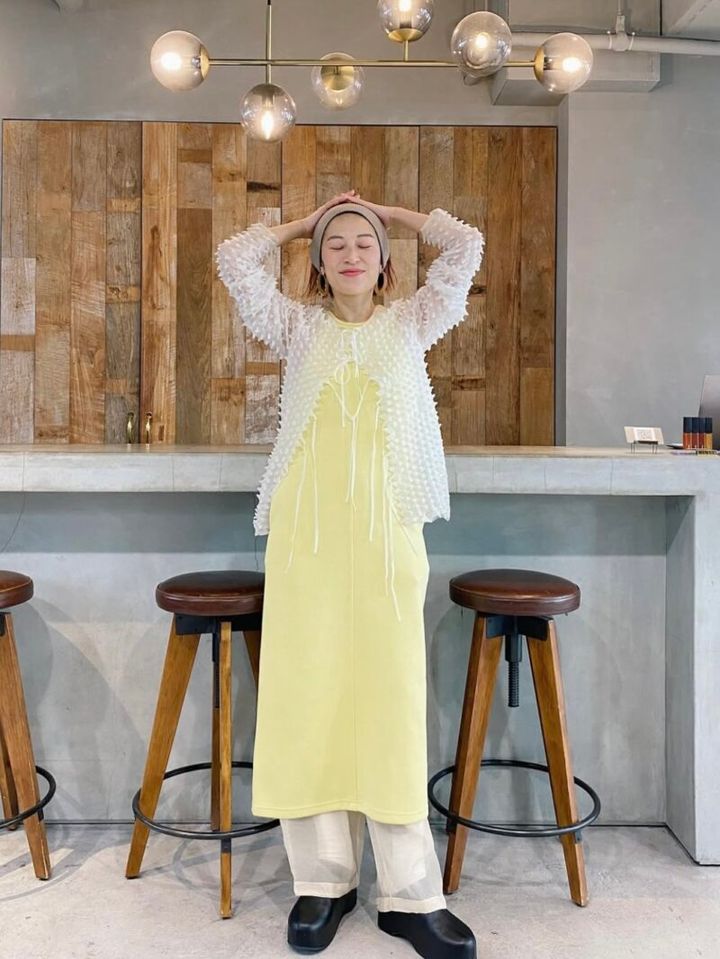 「大好きなイエローワンピースを主役に明るい色でまとめて、足元は黒で締めました。ターバンは襟足が浮かない仕様で、今の髪型に使いやすいんです」ワンピース/room153(カップ&ポケット付) カーディガン/open sesame club パンツ/clane シューズ/clane ターバン/room153