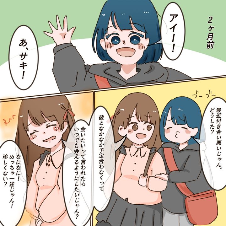 サトシさんの浮気相手のアイさんがケイコさんに会いに来る2ヶ月前のこと。アイさんは友達のサキさんと会っていました。「最近付き合い悪いじゃん。どうした?」と聞かれたアイさんは「彼となかなか予定合わなくって。会いたいって言われたらいつでも会えるようにしたいじゃん?」とはにかみながら答え、「なになに!めっちゃ一途じゃん!珍しくない?」と驚くサキさん。