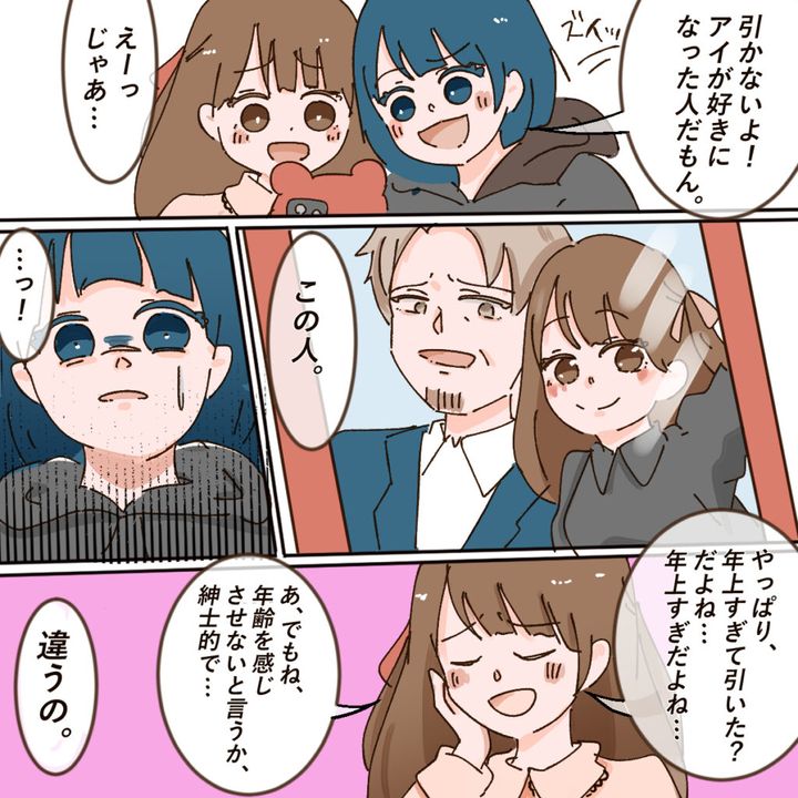 「やっぱり、年上すぎて引いた?だよね、年上すぎだよね。」と言うアイさん。「あ、でもね、年齢を感じさせないと言うか、紳士的で・・・」と、本当に彼氏に陶酔している様子でしたが、「違うの。」と佐紀さんが言葉を遮りました。