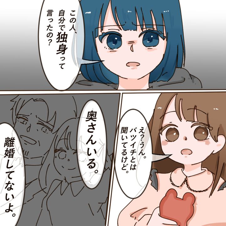 そして、サキさんは真剣な顔で「この人、自分で独身って言ったの?」と聞いたのです。「え?うん。バツイチとは聞いてるけど。」と、キョトンとするアイさんに、「奥さんいる。離婚してないよ。」とサキさんは言い切りました。