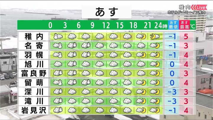 名寄や留萌など朝まで広く雪が降るでしょう。最低気温は0度前後なので、路面凍結に注意して下さい。日中も日ざしがなく、あす4日(金)も厚手の上着が必要です。
