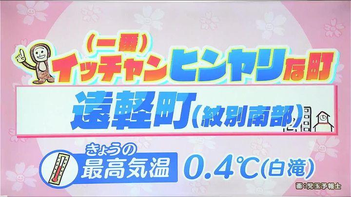 ということで、イッチャンヒンヤリな町です。遠軽町にある白滝という観測所ではきょう3日(木)の最高気温が道内で最も低い、0.4度にとどまりました。4月なのに冬のような寒さですね。しかも朝早くに観測されたので、日中はマイナスで経過しました。