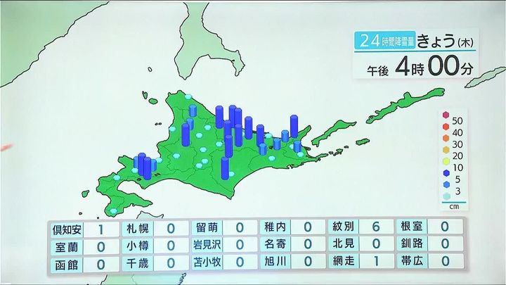 この寒さの影響で雪も降りました。大雪にはなりませんでしたが、午後4時までの24時間にオホーツク海側や内陸、山沿いで5センチくらい。紋別は6センチ、網走や倶知安町は1センチでした。
