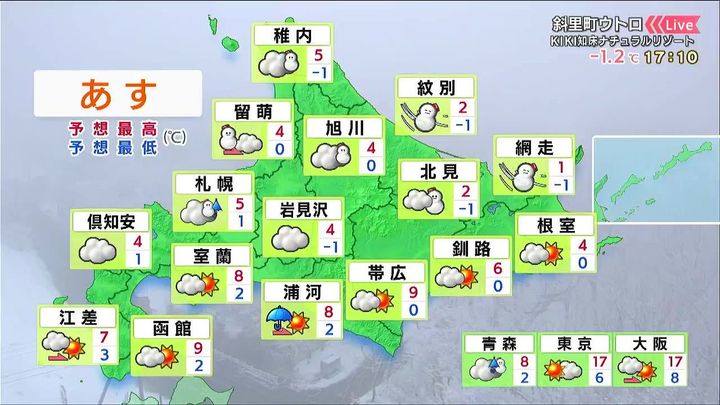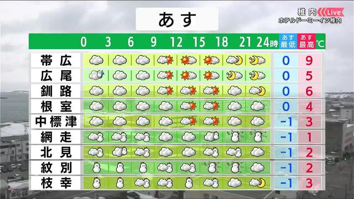 道東は昼頃から日差しが出て、帯広は9度まで気温が上がります。オホーツク海側はあす4日(金)も雪が降り、ふぶくでしょう。網走の最高気温は3月上旬並みの1度です。