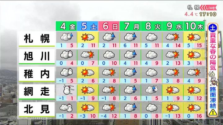 土曜日は晴れて、最高気温は札幌で11度、北見は10度でしょう。春休みの行楽にもいいですが、朝晩は路面凍結に注意して下さい。来週は気温は高いですが、曇りや雨の日が多くなります。