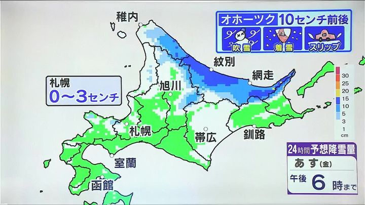 今後もオホーツク海側を中心に雪が続きます。あす4日(金)午後6時までの24時間予想降雪量です。濃い青の紋別周辺や知床半島周辺で10センチ前後です。吹雪や着雪などに注意して下さい。札幌市内でも山沿いでうっすら白くなるでしょう。