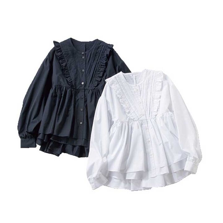 jemma.atelier ピンタックギャザーフリルブラウス ネイビー、ホワイト Price_¥16,500