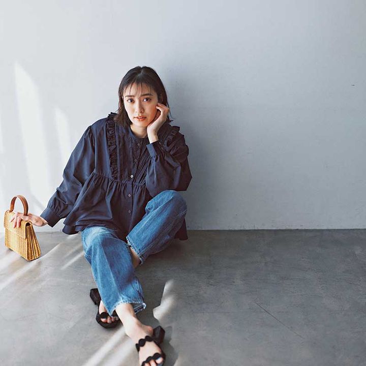 シワになりにくいイージーケア素材を使用。フロントに入った細かいピンタックとフリルがポイント。前あきで羽織りとしても活用可能。甘さたっぷりのブラウスこそ、デニムでカジュアルダウンさせるとおしゃれ上級者な雰囲気に。胸下すぐの位置からふわっと広がる2段のフリルヘムは、気になる腰まわりのカバーにも一役買ってくれます。