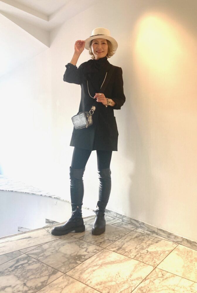 すらりとした高身長を生かしたブラックコーデがひときわ目を引く船渡さん。服をワントーンにまとめ、ポイントとなるハットで華やかにする着こなしは、普段もインスタでプチプラコーデのおしゃれを格上げするアイデアとしてご紹介されているそう。サッとかぶるだけで印象を変えるテクニックは、まねしてみたくなりますね!