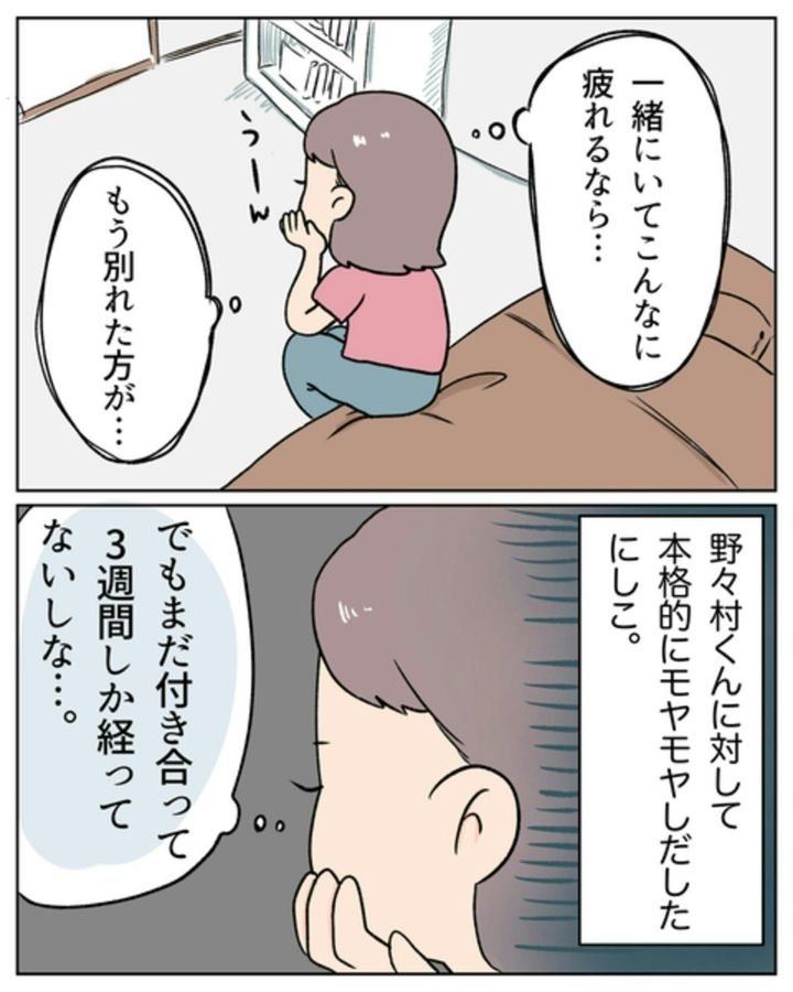 付き合ってまだ3週間ですが、野々村くんの本性が次第にあらわになってきました。にしこさんが注意をすると逆ギレしたり、自分の気分次第で機嫌がコロコロ変わったりと、いつも振り回されてばかり。一緒にいても疲れる相手と付き合い続けるのは、正直、しんどいですね。
