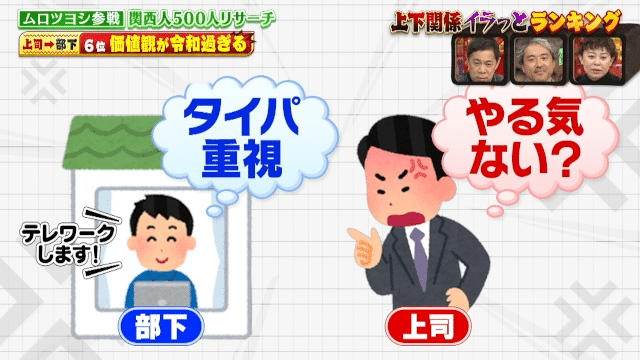 一方、部下世代からは上司に対して「価値観が昭和過ぎる」と不満が大爆発!「髪色とかネイルを注意されたり、いちいち細かい! 時間休とらされて、直しに行かされた。誰に迷惑をかけてるわけでもないのに!」と語気を強める。「紙でちょうだい」「若者は休まず働け」「身なりを整えろ」など、上司のみなさんには当たり前かもしれないが、若者にとってはイラっとするという価値観のズレが露わに。