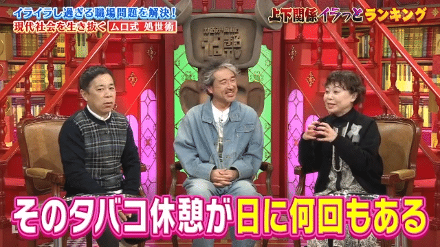 ほかにも上司からは「指示待ち部下が多過ぎる!」「報・連・相がない」「仕事をナメ過ぎ」といった不満が寄せられた。部下からは、上司からの「LINEがめんどくさ過ぎる」といった声が続出。勤務時間外にLINEで叱責されたり、仕事と関係のない趣味の話をされるのが嫌だという。ほかにも、「タバコ休憩が多過ぎる」というイライラも噴出。最近は喫煙者のほとんどが40代以上の上司世代だ。上司にとっては、「タバコ休憩で生まれるアイディアがある」「喫煙所だからこそ話せることがある。会議の延長戦だ」と「タバコミュニケーション」のメリットを力説。これには、なるみ&岡村やムロも芸能界ではよくあると頷く場面もあったが、部下世代からすると「そんなこと言ってる上司ほど仕事ができない」と一蹴。上司vs部下のイライラ紛争は白熱するばかり。
