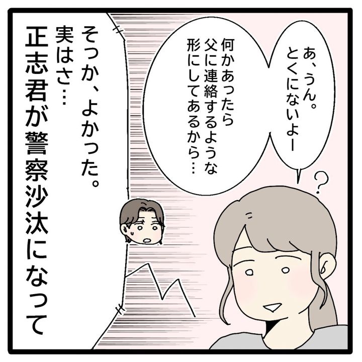 理恵さんは「あ、うん。とくにないよー何かあったら父に連絡するような形にしてあるから・・・」と言うと美沙さんはホッとした様子で「そっか、よかった。実はさ・・・正志君が警察沙汰になって。」と言いました。