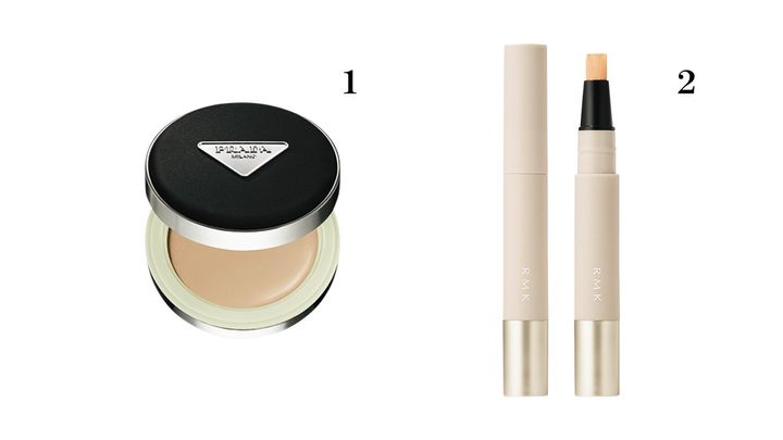 1.プラダ メッシュ クッション LN10 SPF50+・PA+++ ¥11,330 2.RMK コレクティング ヴェール コンシーラー 01 SPF17・PA++ ¥4,400(3/7発売)