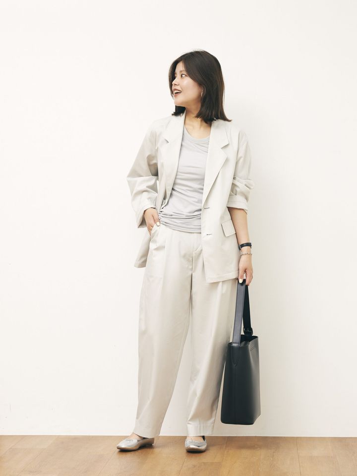 コットンブレンドジャケット[02 LIGHT GRAY]¥7,990 コットンブレンドタックワイドパンツ[07 GRAY]¥4,990 スーピマコットンシアーロングTノースリーブ¥1,500(すべてユニクロユー/ユニクロ)バッグ¥3,990(ユニクロ)その他本人私物