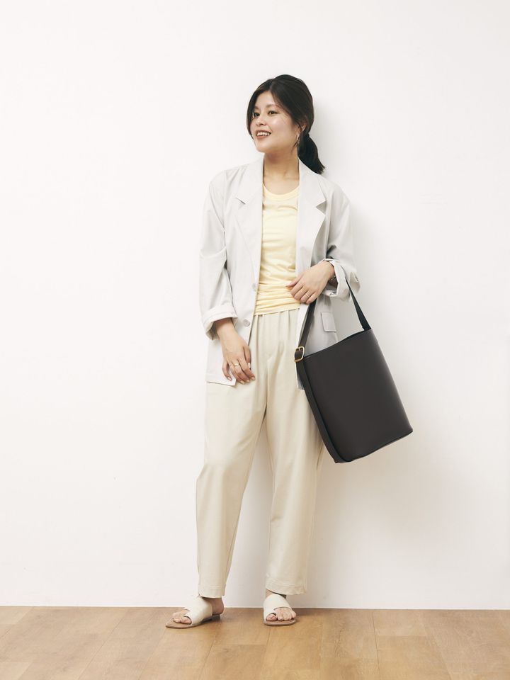 コットンブレンドジャケット[02 LIGHT GRAY]¥7,990 ジャージーギャザーパンツ¥3,990 スーピマコットンシアーロングTノースリーブ¥1,500(すべてユニクロユー/ユニクロ)バッグ¥3,990(ユニクロ)その他本人私物