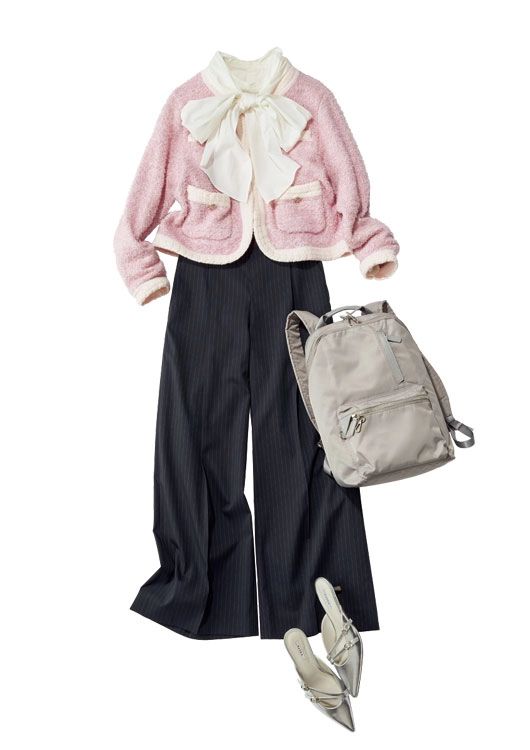 ライトグレーバックパック[W26×H38×D14] ¥22,000/ダブルアンドデイナイト(エース) ニットジャケット¥24,200/マイストラーダ ボウタイブラウス¥17,600/アルページュストーリー パンツ¥30,800/ランバン オン ブルー パンプス¥8,910/RANDA