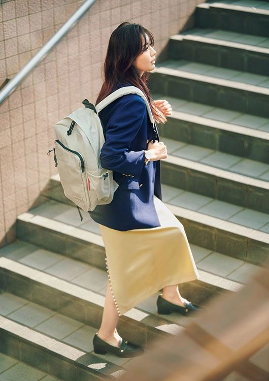 白バックパック[W27.5×H42.5×D15] ¥20,900/マンハッタン ポーテージジャケット¥26,400/CELFORD ルミネ新宿2店 スカート¥51700/ヒュー・デイ・トゥ・イブニング 時計¥29,700/クラスフォーティーン(クラスフォーティーン) ローファー¥10,890/RANDA
