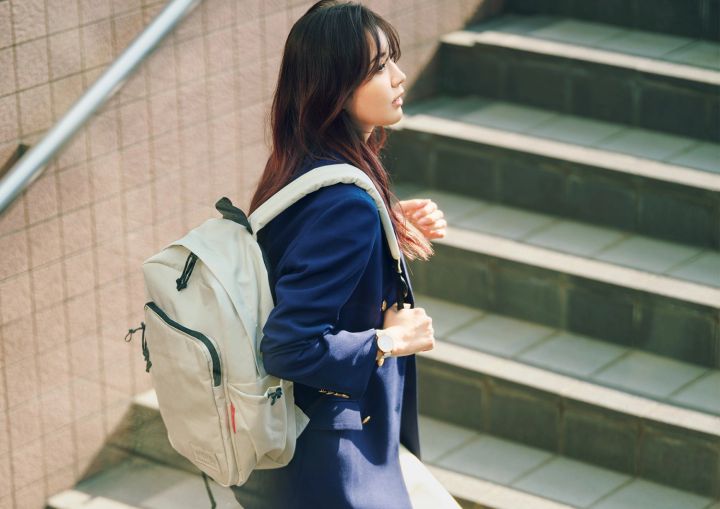 リュックは小さめな淡色でコンサバ感をほどよく拾って