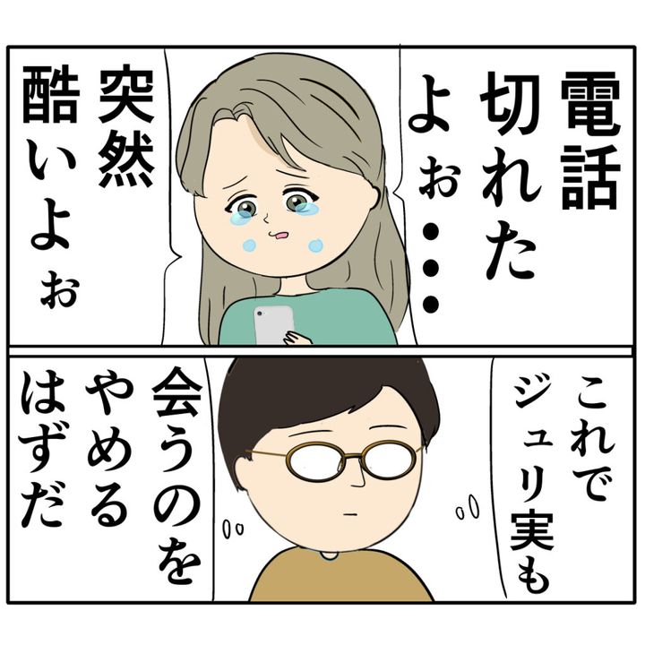 一方的に電話を切られたジュリ実さんは「電話切れたよぉ・・突然酷いよぉ」と涙が止まりません。そんなジュリ実さんを見つめながら「これでジュリ実も会うのをやめるはずだ」とめが根さんは思いました。