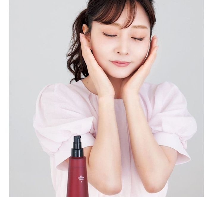 ローションをつけるときはコットンを使わずハンドプレスで。適量を手にとったら顔を包み込むようにしっかり押さえてなじませます。