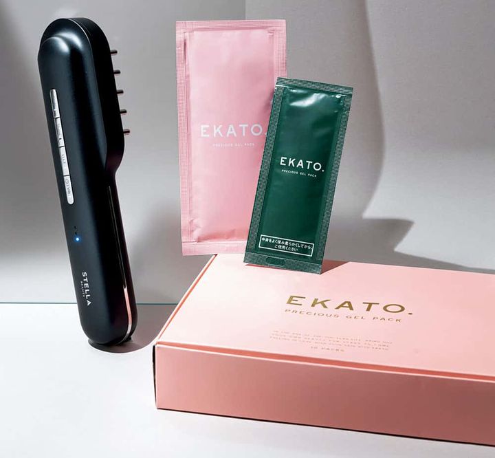 (右)「炭酸持続1時間のパワフルな炭酸パック。血流を高めて肌を活性化。パックをはがした後は洗い流し不要で肌色がワントーンアップします」EKATO プレシャスジェル パック10回分 ¥15,400/EKATO.