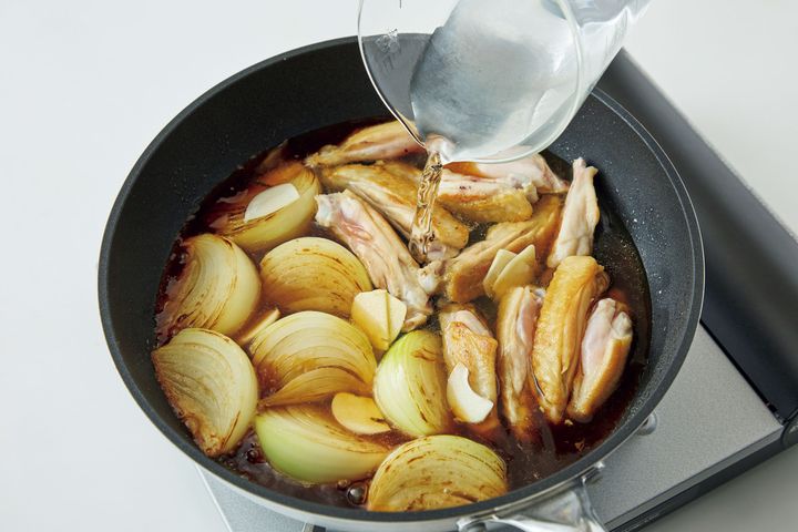 鶏スペアリブは皮目を焼き色がつくまで焼いてから煮ることで、香ばしさが増します。