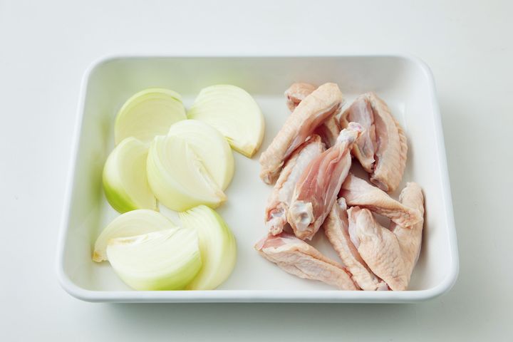 玉ねぎは8等分のくし形に切る。にんにくは縦に薄切りにする。鶏肉は塩ひとつまみをふる。