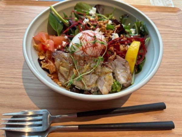 グリルポークと温泉卵のベジライス、1,280円。ベジライスはライスと言うよりもち麦などの雑米が下に少しある感じで足りるかしら?と心配でしたが、エア・ウォーター系列の自社農場で採れた新鮮野菜とやわらかいポークに満足!!