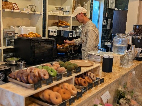 お店に入ると、ドーナツを揚げる香ばしい香りが店内に広がり、食欲をそそられます。店内にはナチュラルな雰囲気のテーブルと椅子が並び、席は約7席。ほっこりと落ち着く空間です。
