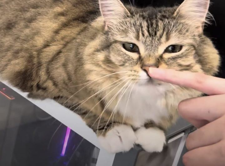 3. パワー注入中? 光るパソコンに座って動かない猫さんの姿が可愛い