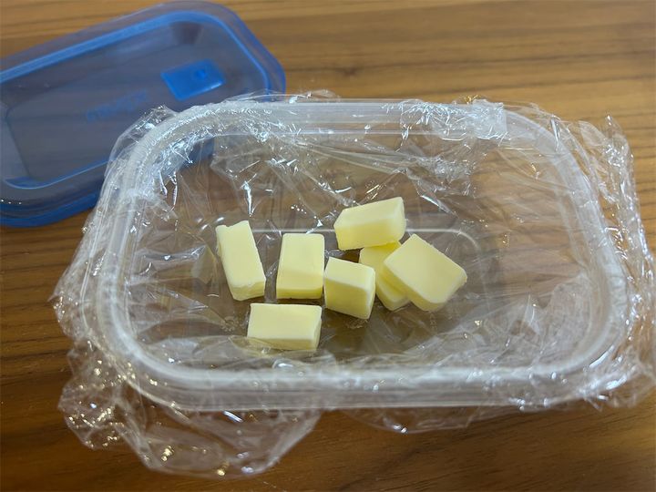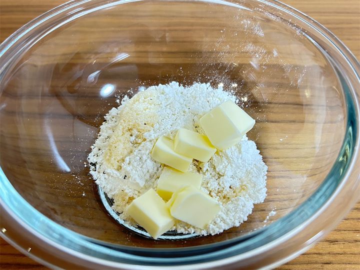 バターを角切りにし、冷蔵庫で15分ほど冷やしておきます。バターは計量している間に手の温度で柔らかくなってしまいがち。