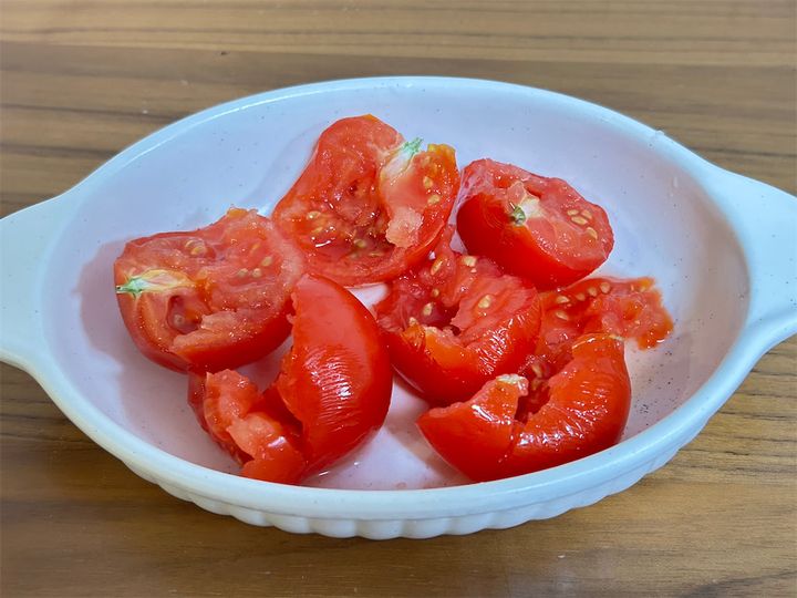 生で食べるトマトも好きですが、加熱したことでより甘味が増しているのもおいしいです。